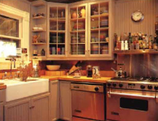 THE DISHWASHER,SINK,AND DISH CABINET make a tight trio in this kitchen , but there's enough space to load and unload the dishwasher comfortably. Awood countertop is gentle on dishes, although most dishes head straight into the glass-door cabinets.